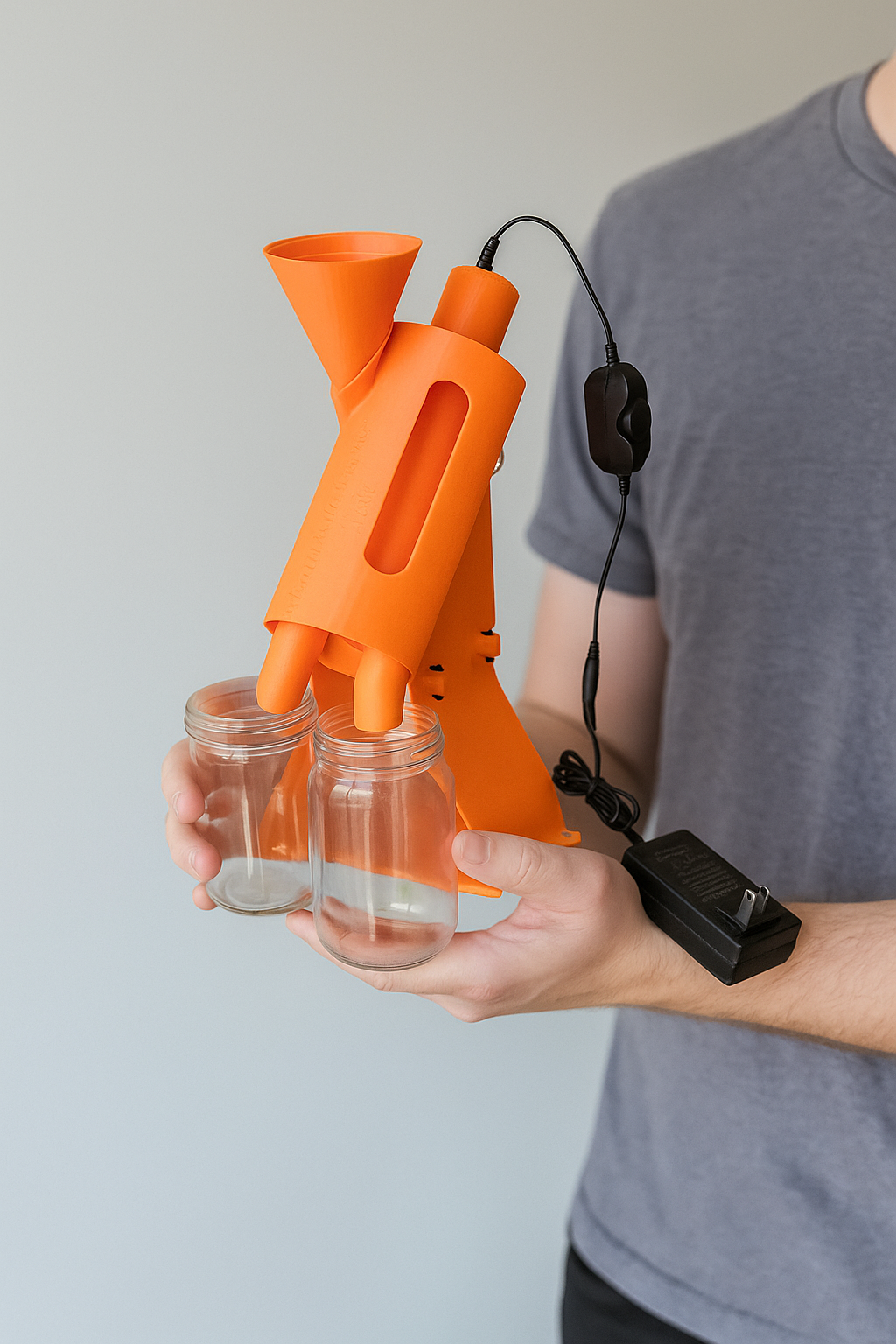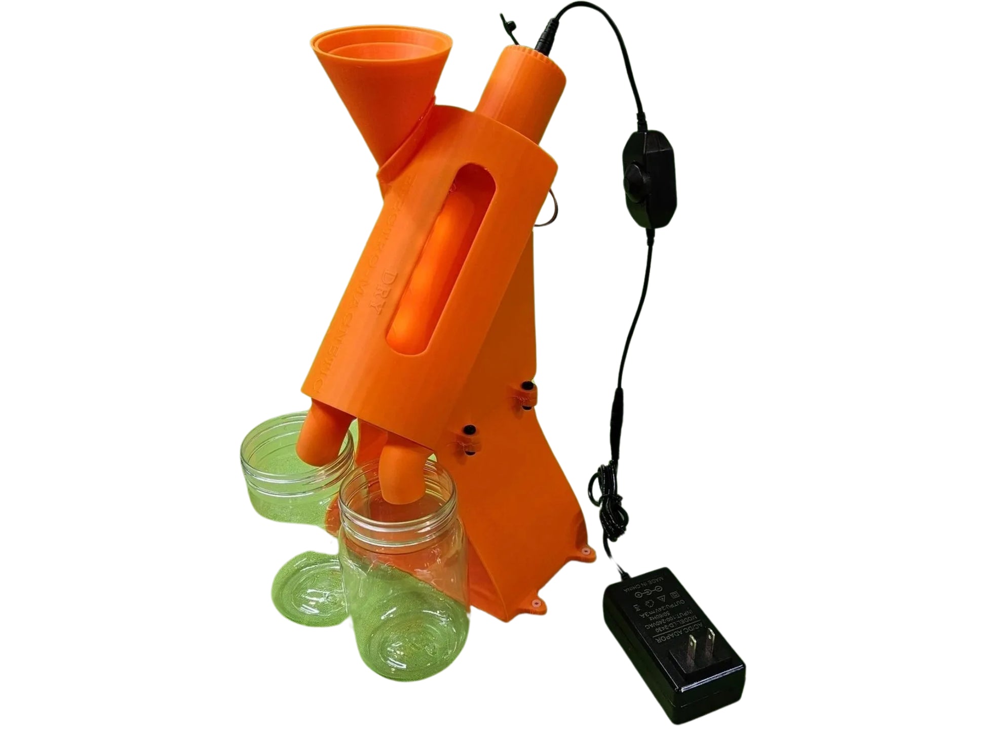 Unlike the Magnetite Mover, the Magnetite collector is intended for continuous throughput. Dry Classified (sub-12 mesh) working material is fed into the top hopper, where funnels control a consistent flow of material into a pulsing magnetic field. In this field, the magnetite is collected and deposited into a jar, while the non-magnetite material is deposited into a separate jar.